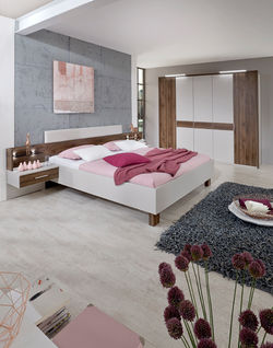Imola is a stylish new, affordable range featured in a fresh new finish of soft champagne with nocce (a rich, grained walnut look) highlights. Despite its budget price tag, Imola offers a comprehensive choice of pieces, suitable for bedrooms of many sizes and shapes, including hinged and sliding door wardrobes ( up to three metres in width which can be customised with cornices and frames incorporating LED lighting, two bed styles in four double sizes, including UK king size, plus a varied ranges of chests and bedside arrangements, a storage bench and mirrors.